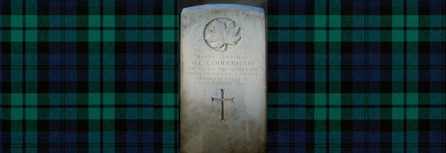 At Tilly, the Regimental Aid Post (RAP) (see Pte Richard McDonald) and the Regimental padre, HCapt Charlie Maclean, began their wartime work in earnest. The stretcher-bearer thought Pte Wingate was just wounded and he was brought to the RAP dead. ACpl Gooderham was almost certainly killed immediately. Maclean buried him at Tilly west of the “R.R. tracks.” There was typically a short service and a Regimental piper played the Argyll lament “Flowers of the Forest.” The padre collected anything personal in the battle dress. Coningsby Gooderham left little by way of personal effects: a “photocase,” some snapshots, 2 photographs, and his identity bracelet.